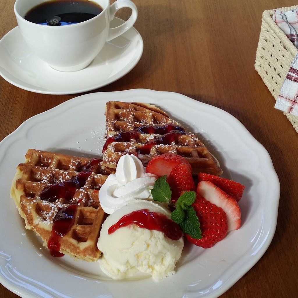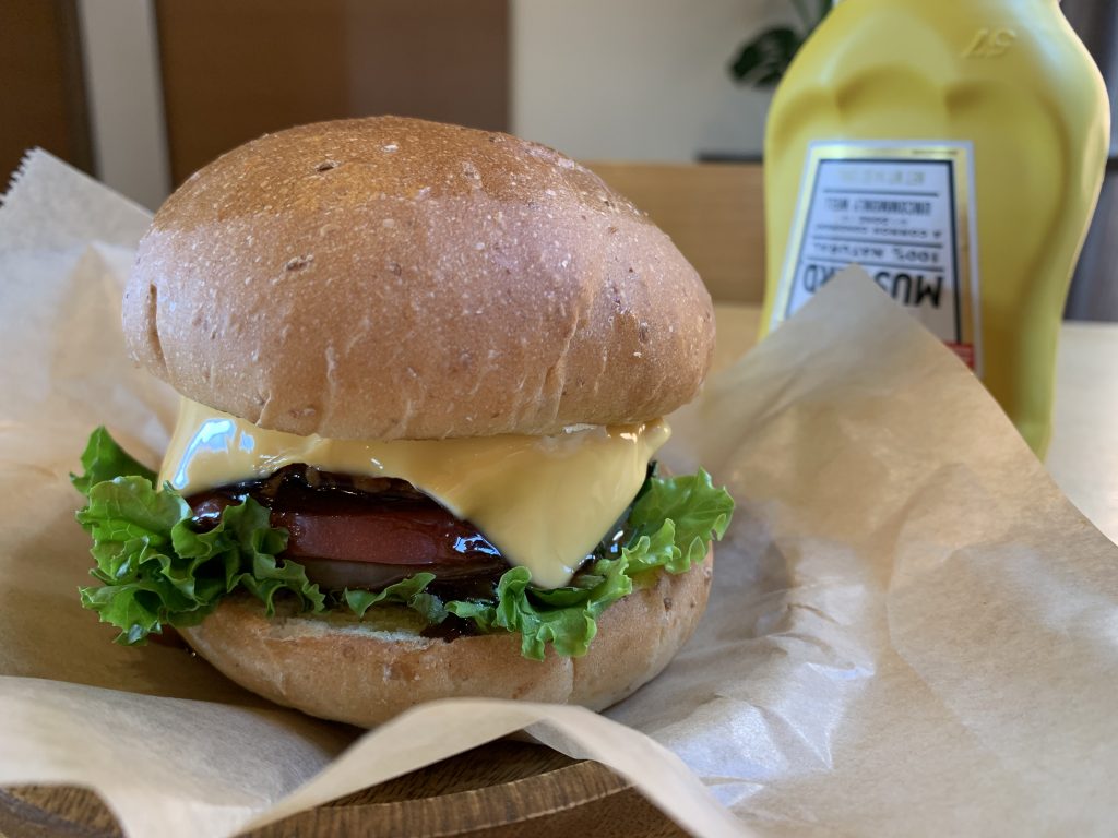 ボリュームいっぱいのハンバーガーを提供します。メイプルシロップをかけて食べる自家製ワッフルもおすすめ。